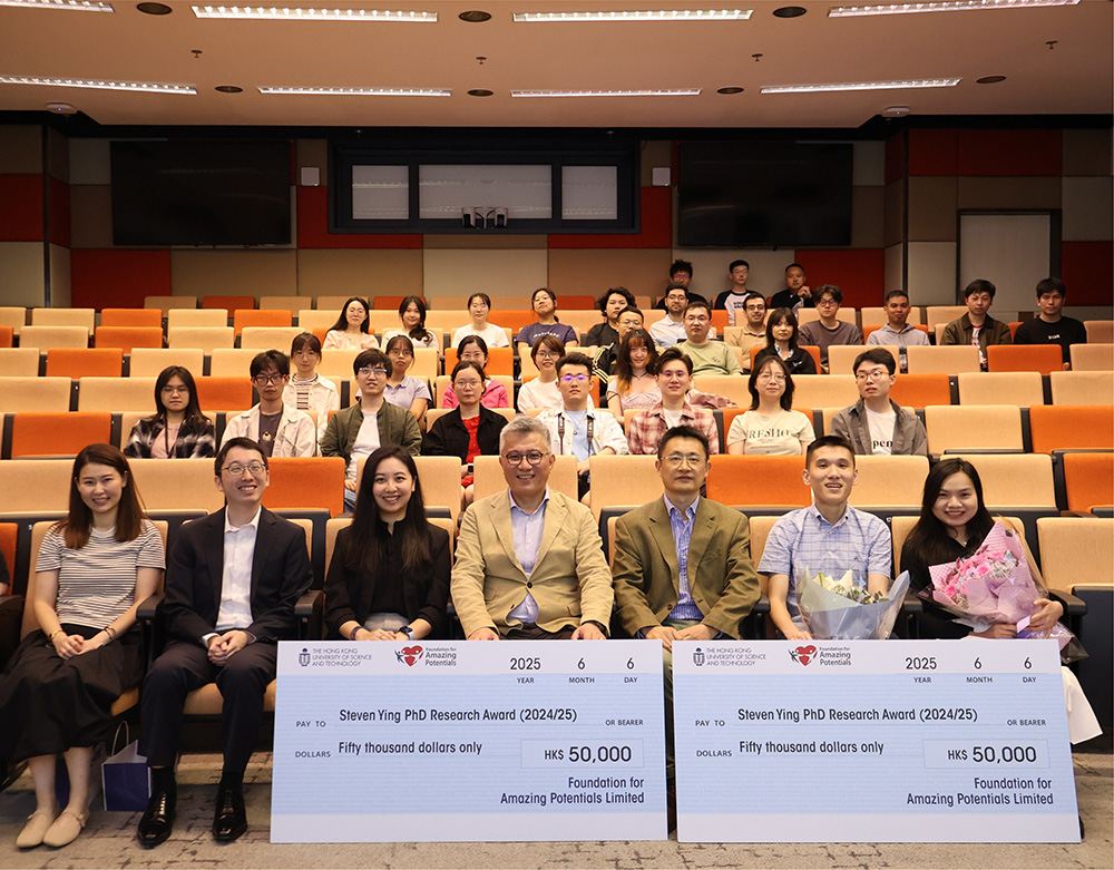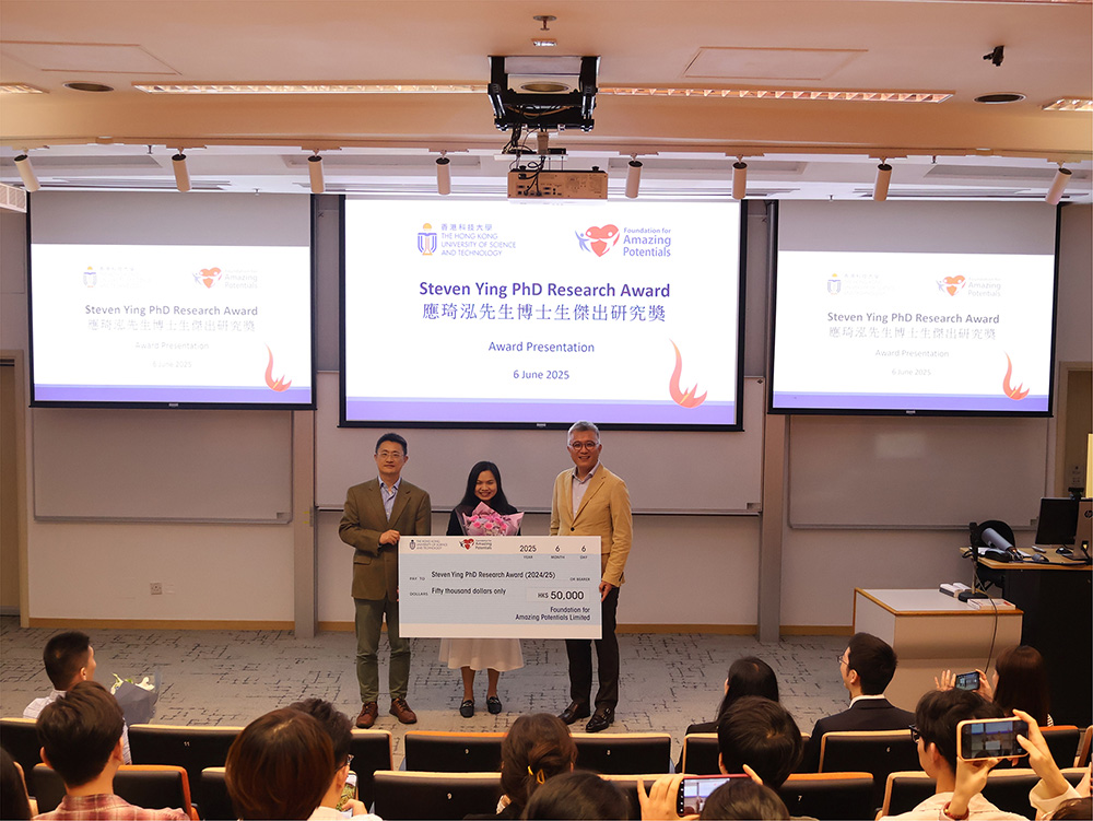 Among 23 applications, Ms. Liu was selected alongside Mr. Chen ZHAO, a Year 3 PhD student from the Department of Ocean Science. The awards were presented by Mr. Steven YING, Director of the Foundation for Amazing Potentials, and Professor Minhua SHAO, Director of the HKUST Energy Institute, Cheong Ying Chan Professor of Energy Engineering and Environment, and Head and Chair Professor of Chemical and Biological Engineering.