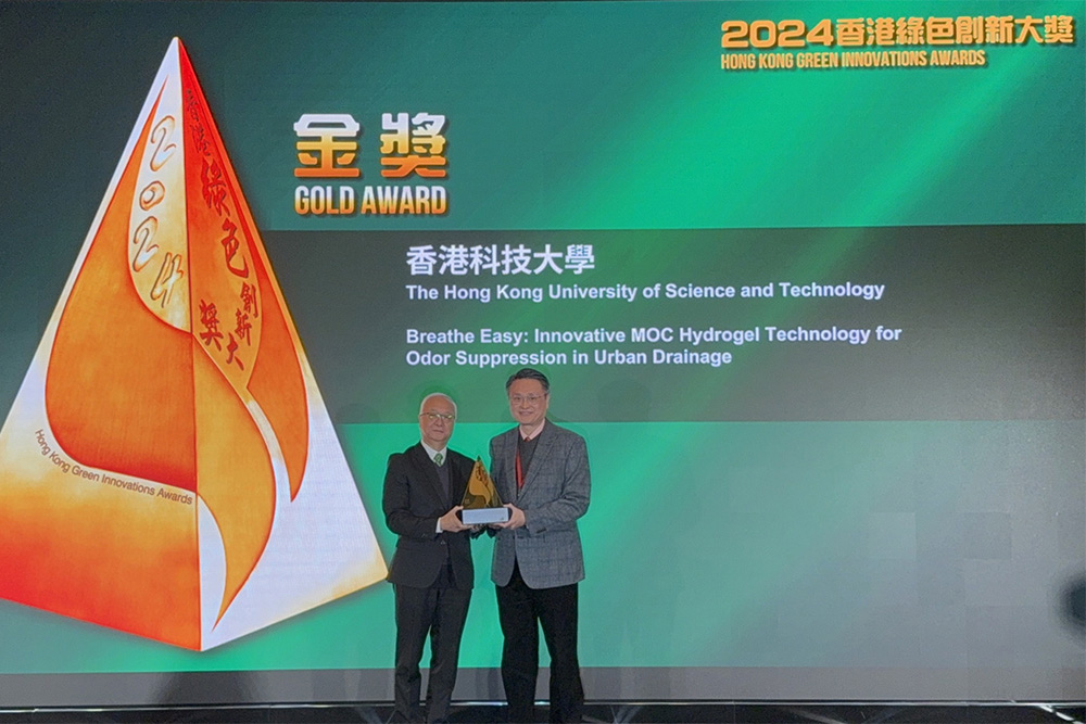 Prof. King-Lun YEUNG, Chair Professor of the Department of Chemical and Biological Engineering (CBE) and the Division of Environment and Sustainability (ENVR) at The Hong Kong University of Science and Technology (HKUST), has recently won the prestigious Gold Award at the 2024 Hong Kong Green Innovations Awards (HKGIA). This esteemed recognition commends his team’s revolutionary project, “Breathe Easy: Innovative MOC Hydrogel Technology for Odor Suppression in Urban Drainage,” which has significantly advanced urban odor management.